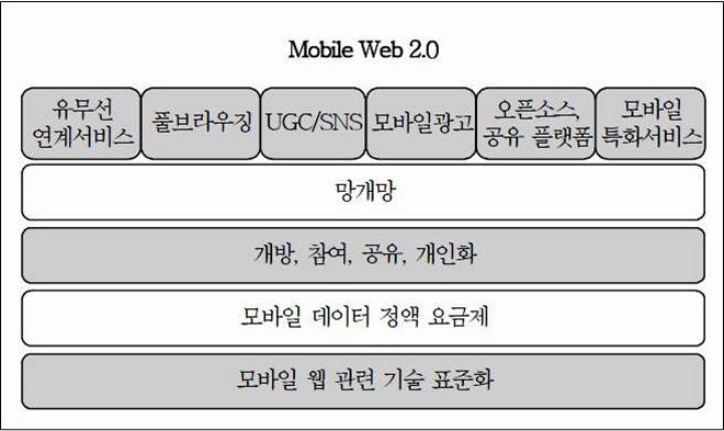 - 모바일 관련 산업의 중요성이 증대되고 모바일 기술이 급격히 발전하면서 지난 수년간 우리 사회 곳곳에 등장한 2.0 패러다임은 모바일 웹 2.0 패러다임을 등장시키며 정보통신산업에 큰 변화를 초래